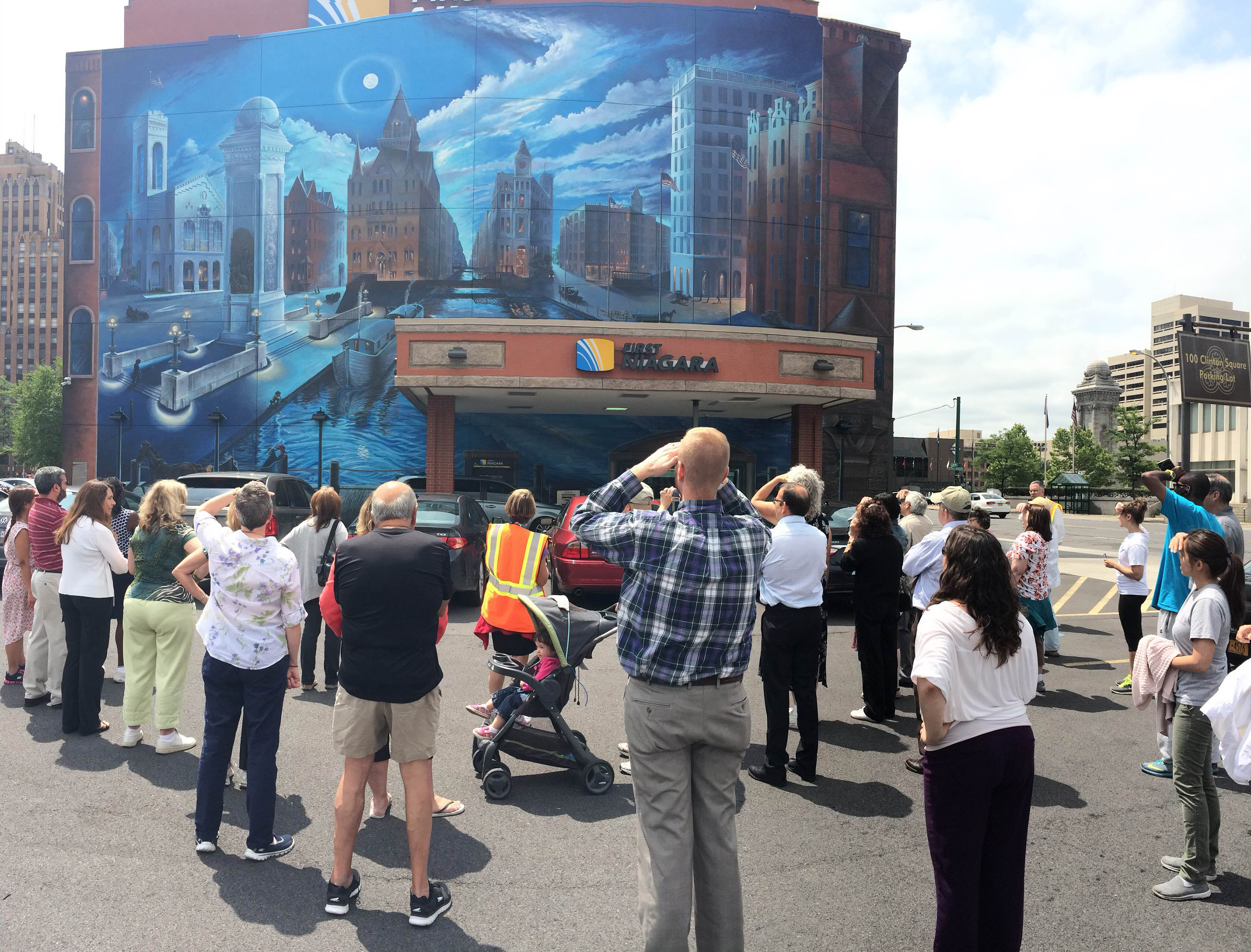 OTHERS IN JUNE: June 22: “Clinton Square Walk,” a shorter, slower noon walk—the special “seniors and friends” walk, in coordination with two local senior centers located near downtown and led by professor Dennis Earle from the Syracuse University School of Design—focused on the history of the Erie Canal, the original heart of Syracuse; June 29: “Tree ID Walk,” a noon tour featuring trees of downtown and information about how to plant and maintain them.