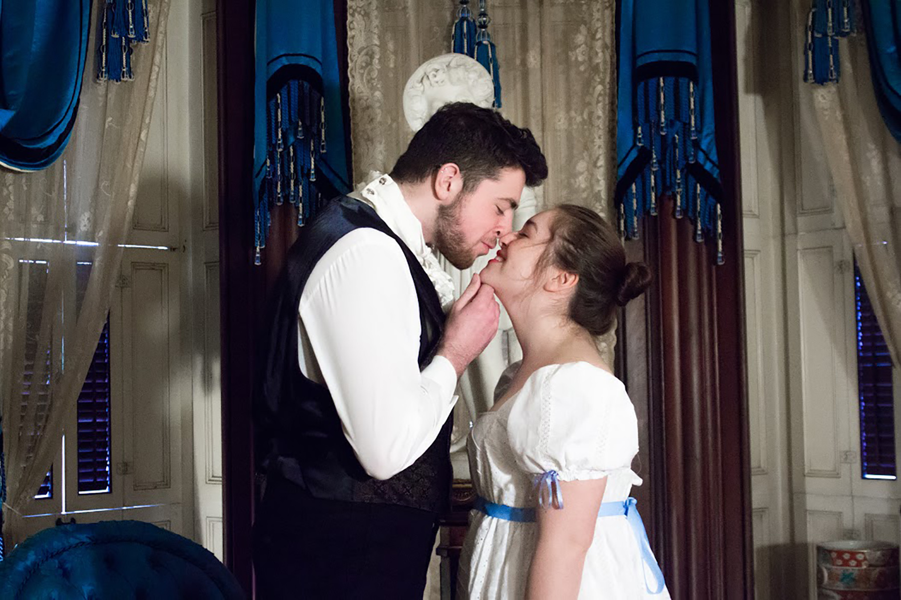 Mr. Darcy (Sean Ryan) and Elizabeth Bennet (Alex Matsu) lean in for a kiss as their love kindles despite past antipathy in the SUNY Oswego theatre department's update of "Pride & Prejudice," based on Jon Jory's adaptation of the classic 19th century novel by Jane Austen. Theatre faculty member Mya Brown directs the play, opening at 7:30 p.m. Friday, April 21, at Tyler Hall's Waterman Theatre. For run dates and ticket information, visit tickets.oswego.edu.