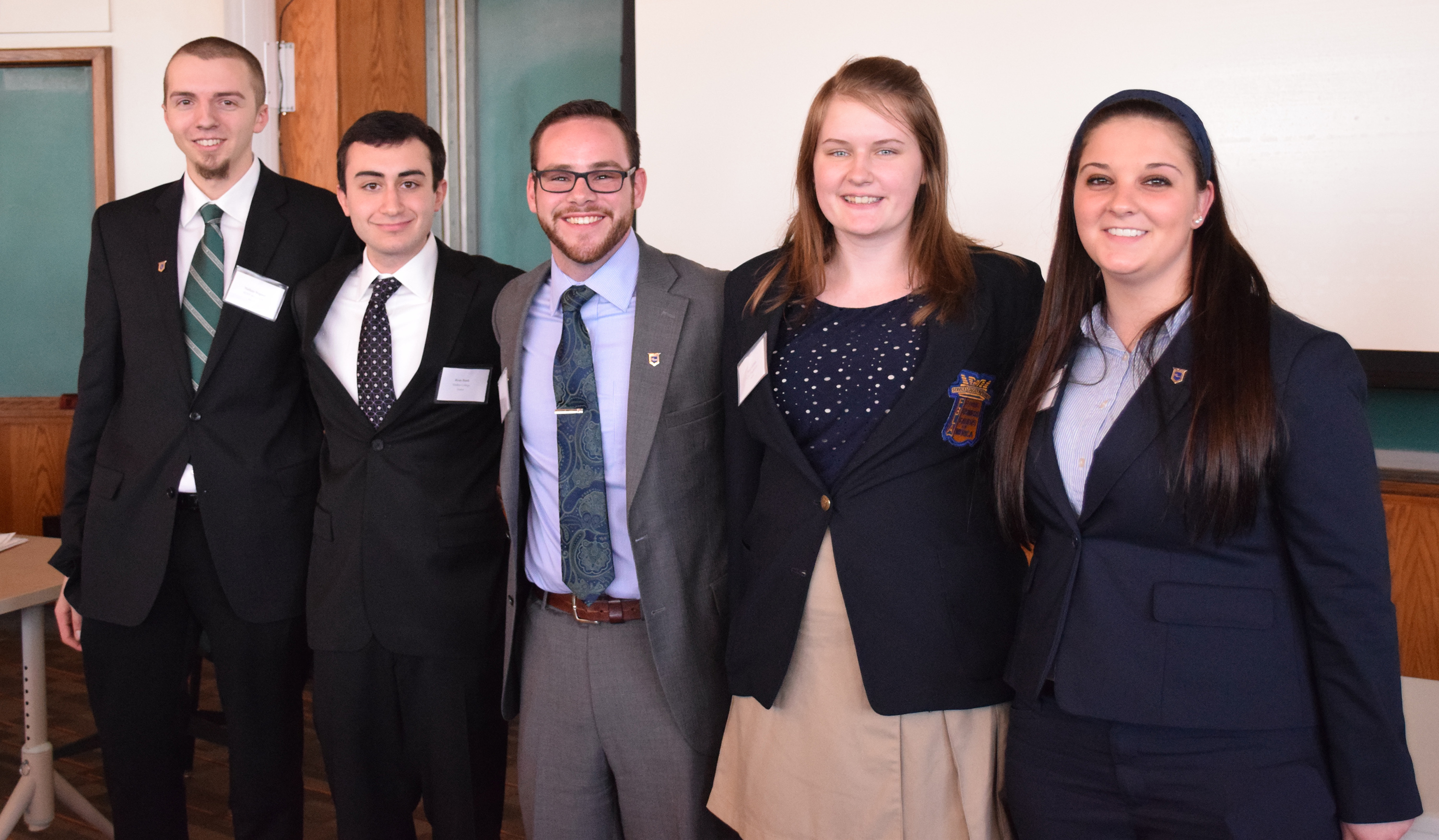 Oswego School of Business juniors Mark Prezioso (center), a finance major, and Elena Margrey (right), a five-year accounting/MBA major, will serve as 2016-17 president and secretary, respectively, of the state organization. Other officers (from left) are Nathan Wagner of SUNY Morrisville, marketing director; Ryan Bank of Mercy College, executive vice president; and Mary Golden of SUNY Binghamton, parliamentarian.