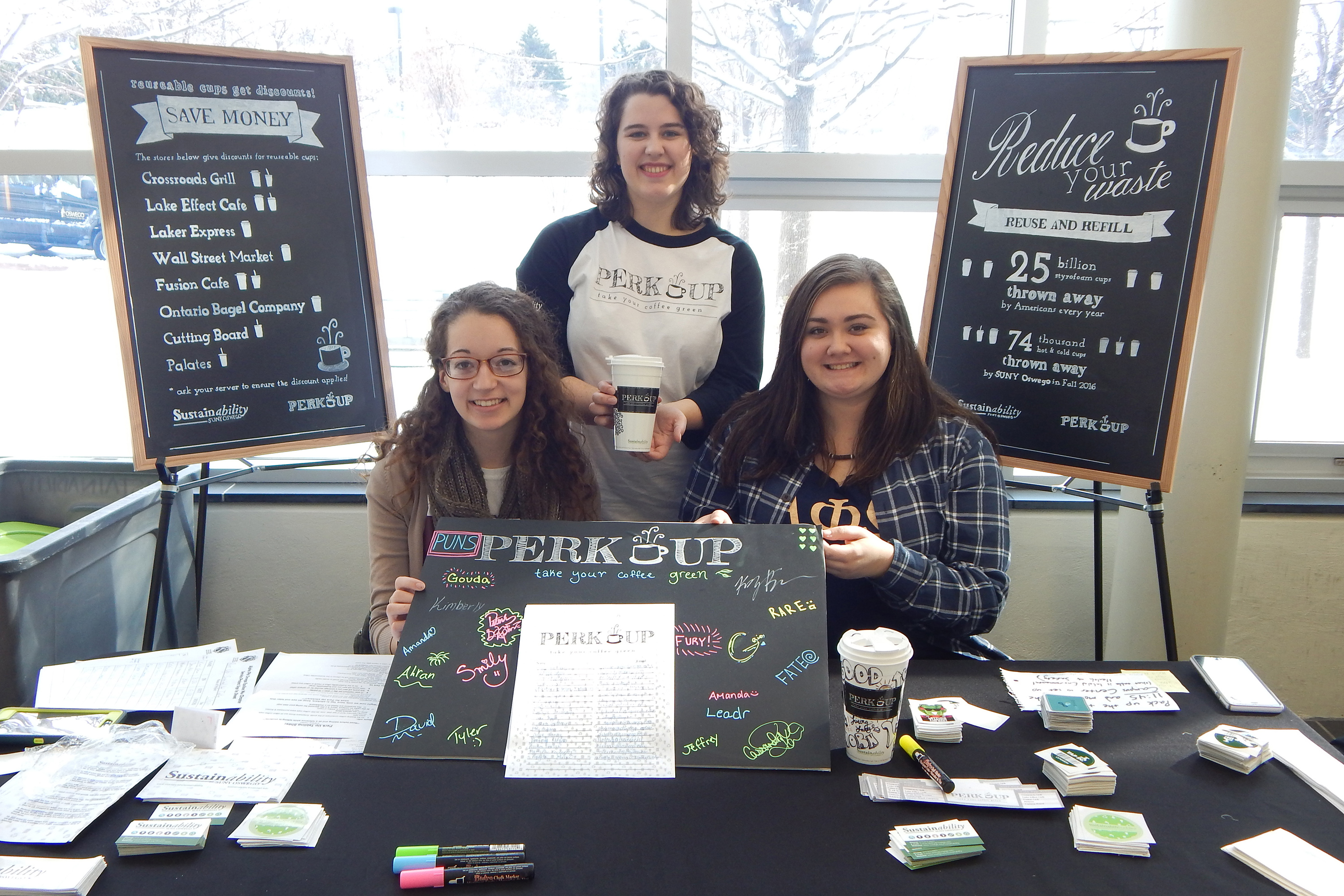 The students have taken on projects such as Tap In, which has offset about a million plastic bottles of water with sustainable options such as refillables; a similar program for coffee drinkers called Perk Up has saved 3,000 cardboard cups; Local Food Awareness and Procurements, a farm-to-table collaboration with Auxiliary Services; Save the Trees, which in its first week and a half saved 13,500 pages of paper; Recyclemania, a national competition won by SUNY Oswego volunteers two years in a row; the Leave Green program, enabling students to donate clothing and items from their residences rather than trashing them; and the national-award-winning BikeShare and BusShare programs.