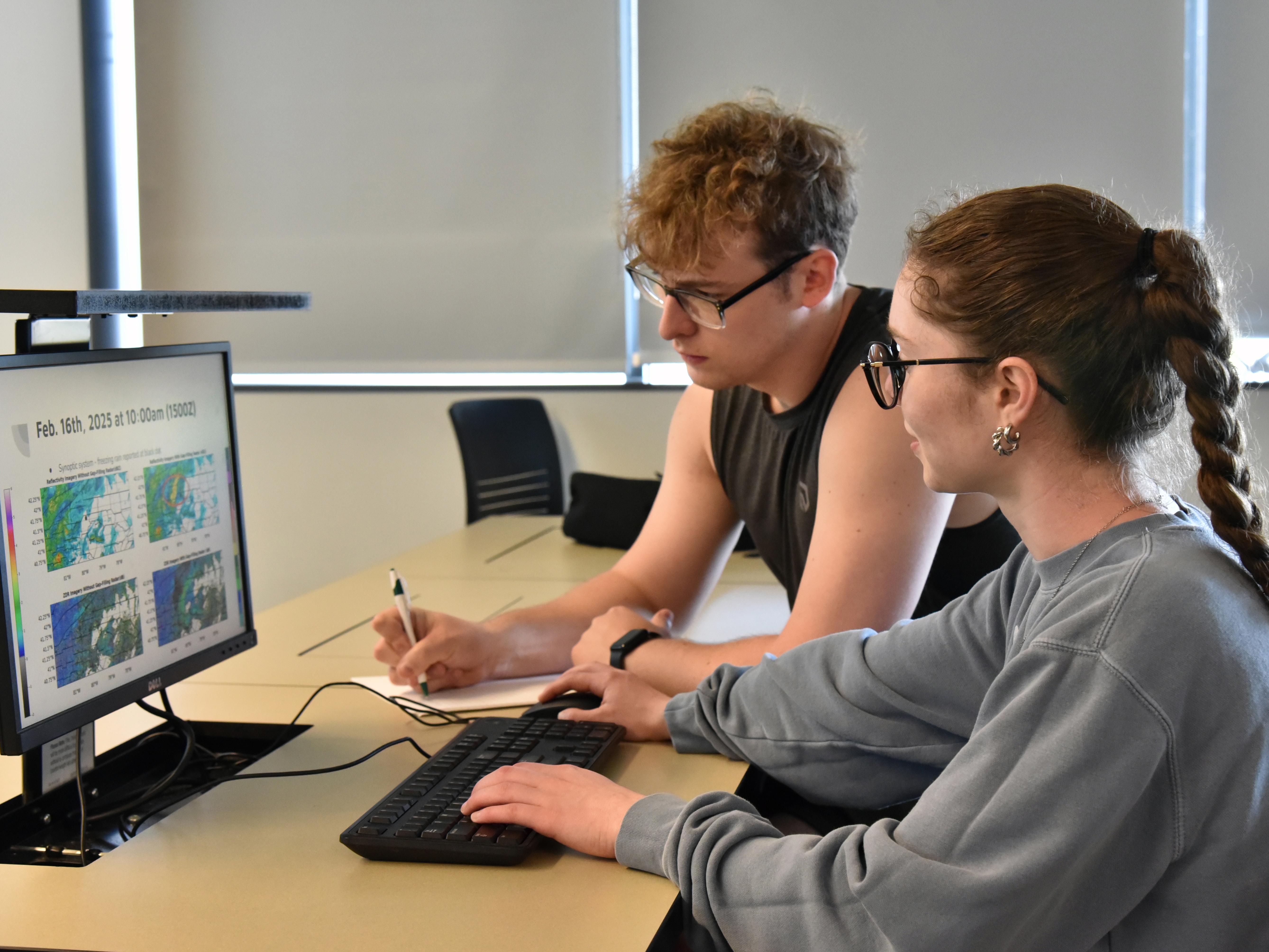 Tom White and Zoe Bush, who just earned their meteorology degrees in May, look over data from their research with Climavision related to gap-filling radar.