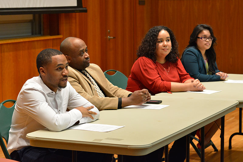 Joining a panel discussion titled "Navigating the Workplace" on March 20 in Marano Campus Center auditorium are (from left) alumnus Khayri Klass, class of 2016, operations analyst for National Debt Relief; Earnest Washington, director of campus life; Arlene Quinones '15 and career coach Jennifer Roxas of the Office of Career Services.