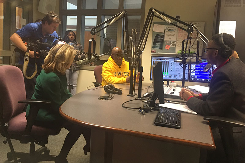 Interviewer Lamont Sadler (right), an on-air talent for student-run WNYO-FM, speaks with NBC "Today" show co-host Al Roker and college President Deborah F. Stanley March 30 in WNYO's Marano Campus Center studio for a preshot spot for SUNY Oswego's participation in Rokerthon 3 on March 31.