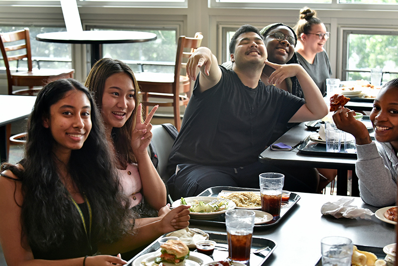 Educational Opportunity Program student leaders enjoy some dinner at Lakeside Dining Hall on June 30. The EOP summer program returned to campus this year, running July 5 to 30, with everything but the first week in person. The program fulfills New York State's commitment to provide access, academic support and financial aid to students who show promise for succeeding in college but who may not otherwise be able to attend.