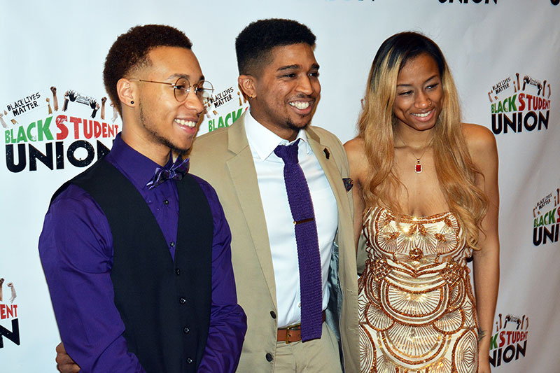Black Student Union president Keonna Wren (right) and vice president Markel Jeffries flank alumnus and BSU 50th Anniversary Dinner keynote speaker Justin Brantley Feb. 24 in Hewitt ballroom. Four dance troupes, the Gospel Singers and a poet were among performers for the gala event, which attracted a full house of students, alumni, faculty and staff.