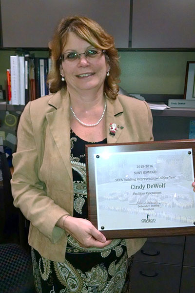 Cindy DeWolf, secretary for Facilities Maintenance and Operations in the maintenance building (Building 12), displays her award as State Employees Federated Appeal Building Representative of the Year. The campaign, guided on campus by the SEFA Committee and building representatives across campus, annually raises tens of thousands of dollars for charities in Oswego as well as around the region, state and world. (Submitted by Kristin Gublo)