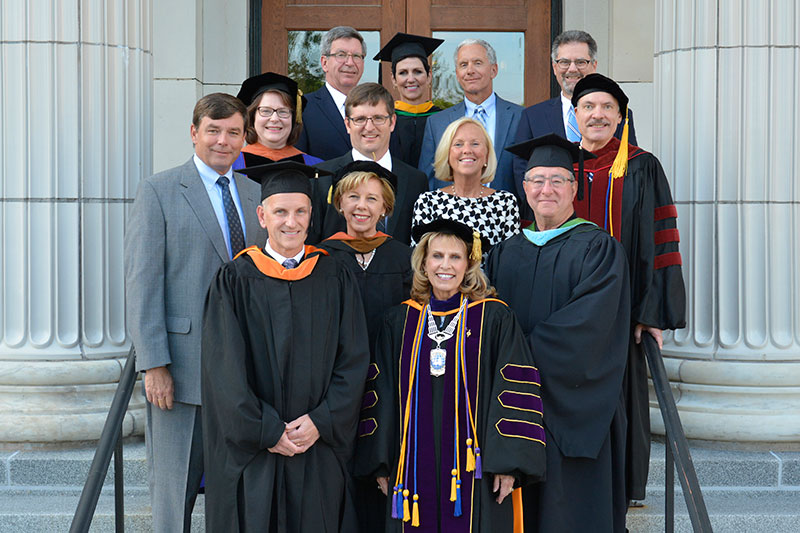 SUNY Oswego administrators and faculty members and SRC Inc. executives celebrate the graduates of an MBA program put together exclusively for the company three years ago. College President Deborah F. Stanley (front) greeted and delivered the charge to the graduates at the special commencement in Sheldon Hall ballroom. Watch commencement video and see more photos