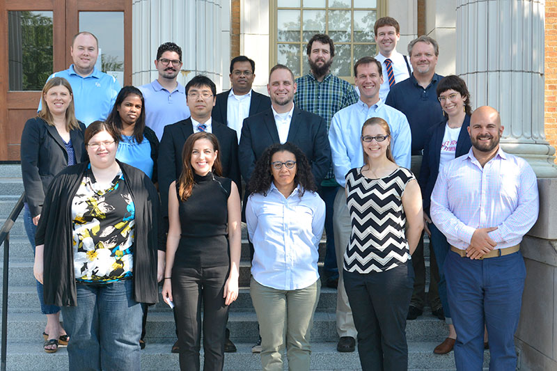 The college recently welcomed new visiting assistant professors, including (top from left) Greg Churchill of mathematics, Robert Freund of counseling and psychological services, Mohammad Iqbal Ahmed of economics, Thomas Kern and Daniel Kraus, both of mathematics, and Robert Allen of music; (middle from left) Catherine Loper of communication studies, Indu Rasika Churchill of mathematics, Jae Woong Lee of computer science, Stephen Papay of health promotion and wellness, Patrick Schultz of modern languages and literatures and Natalie Hoskins of communication studies; and (front from left) Jessica Hample and Emily Dolan, both of communication studies, Yolanda Brooks of biological sciences, Sarah Harris of chemistry and Brian Rundle of psychology.
