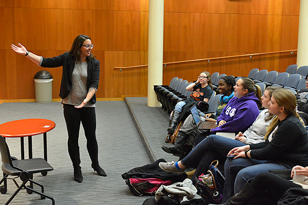 Suzayn MacKenzie-Roy, class of 2008 and now stage manager for the national tour of "Annie," speaks with theater students Feb. 29 in Marano Campus Center auditorium through the Alumni in Residence program. Quentin Mariano, a 2015 graduate who is deck electrician for Troika Entertainment and the "Annie" national tour, also spoke.