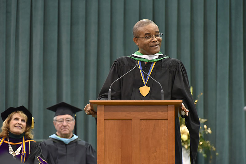Howard Gordon, the longtime executive assistant to the president at SUNY Oswego and a part of the campus family for more than four decades, gave an inspirational keynote speech Dec. 15 at December Commencement. Gordon, who retired in 2018, recalled being in the shoes of the graduates as a two-time Oswego alumnus, earning a bachelor’s in history in 1974, followed by a master’s in English in 1978.