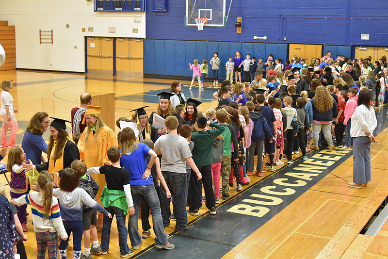 SUNY Oswego student teachers at Frederick Leighton Elementary School in Oswego enjoy a very special send-off May 17, the day before the college’s Commencement. Nine undergraduates earning their bachelor’s degrees in elementary education and three SUNY Oswego School of Education faculty processed in front of a crowd that included elementary school students, their families, administrators from the college and school district, and families of some of the degree candidates in a ceremony hosted by Kara Shore, principal of Leighton Elementary. The children read letters and poems and offered gifts to their student teachers in an emotional goodbye and thank-you ceremony.