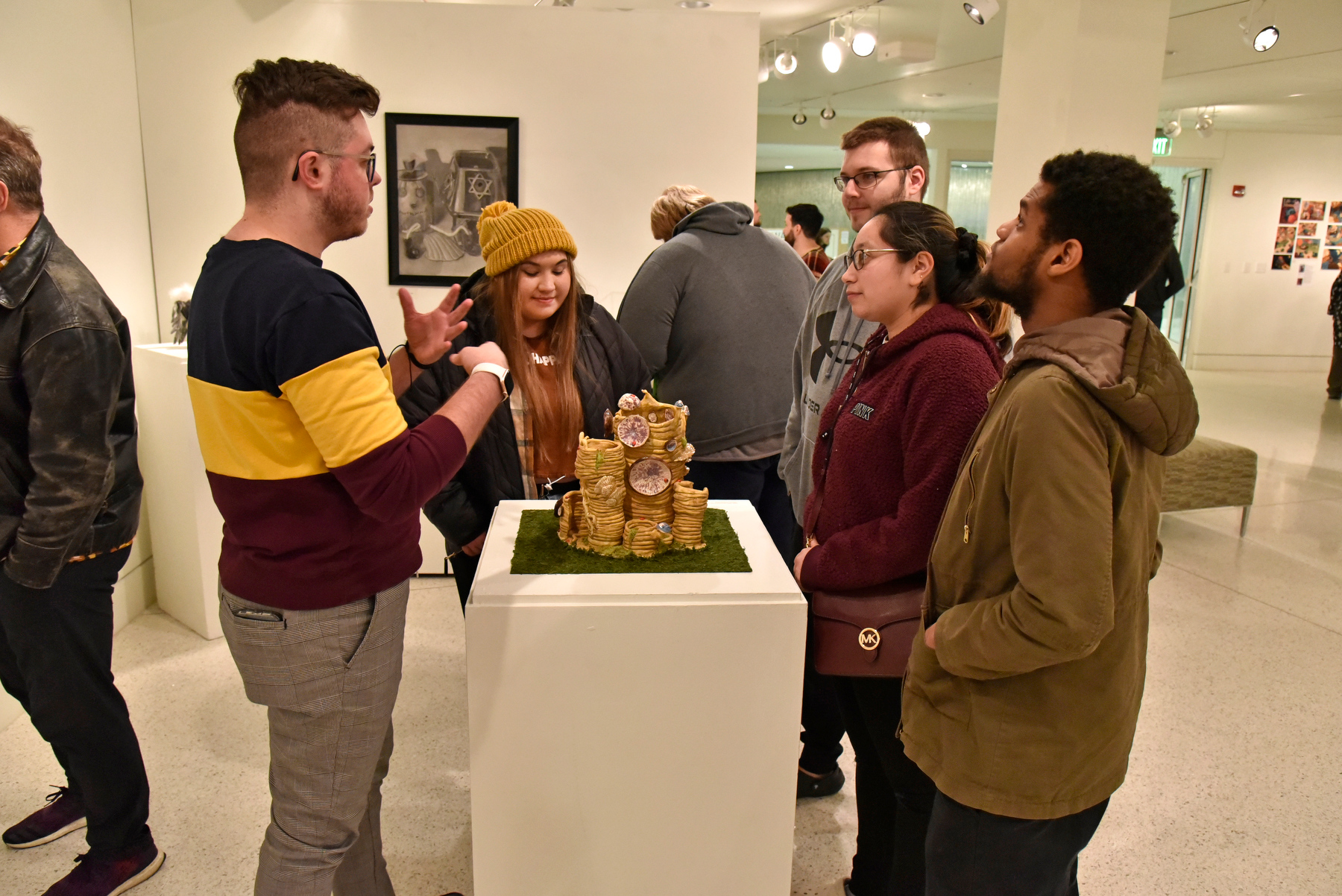 Isaiah Allen, left, talks with some friends about his art pieces during the Dec. 2 reception for the Bachelor of Fine Arts Exhibition held in Tyler Art Gallery. His ceramic piece in foreground is titled "Mushrooms with Lady Bugs and Frogs." The Fall 2022 BFA Exhibition "Genesis" celebrated the work of design and studio art students throughout their college years. Continuing the high standard expected of Oswego art graduates, each student presents a selection of work as part of their degree requirement. Designed and installed by the students themselves, the exhibition showcases a multitude of artistic media and conceptual approaches.
