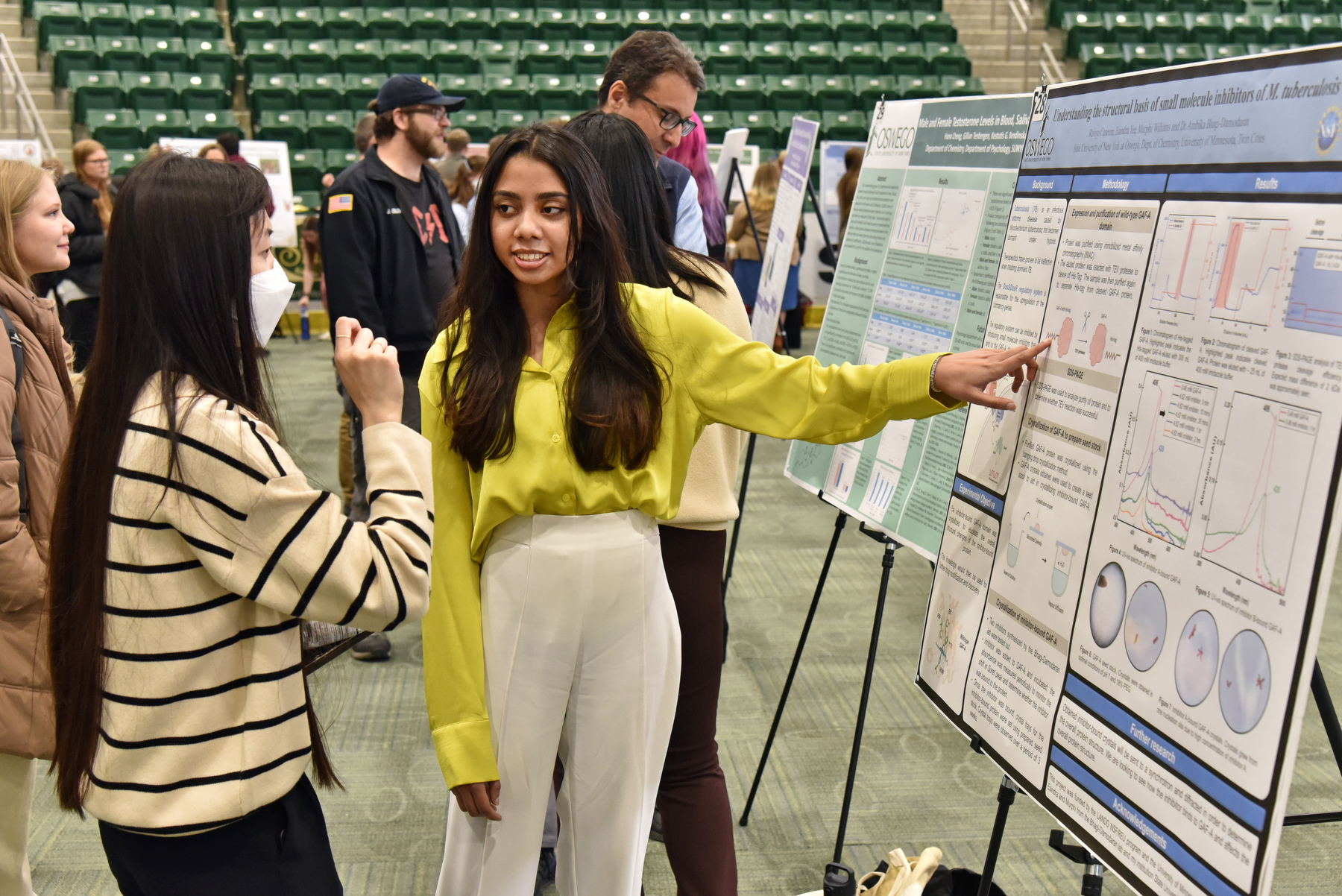 Biochemistry major Fathima Raviya Careem talks about her research into understanding the structural basis of small molecule inhibitors that bind to the GAF-A domain on the DosS/DosR regulatory system, responsible for tuberculosis dormancy, during this year’s Quest on April 19. Careem also presented this research at the World Congress of Undergraduate Research (WorldCUR) in the U.K.