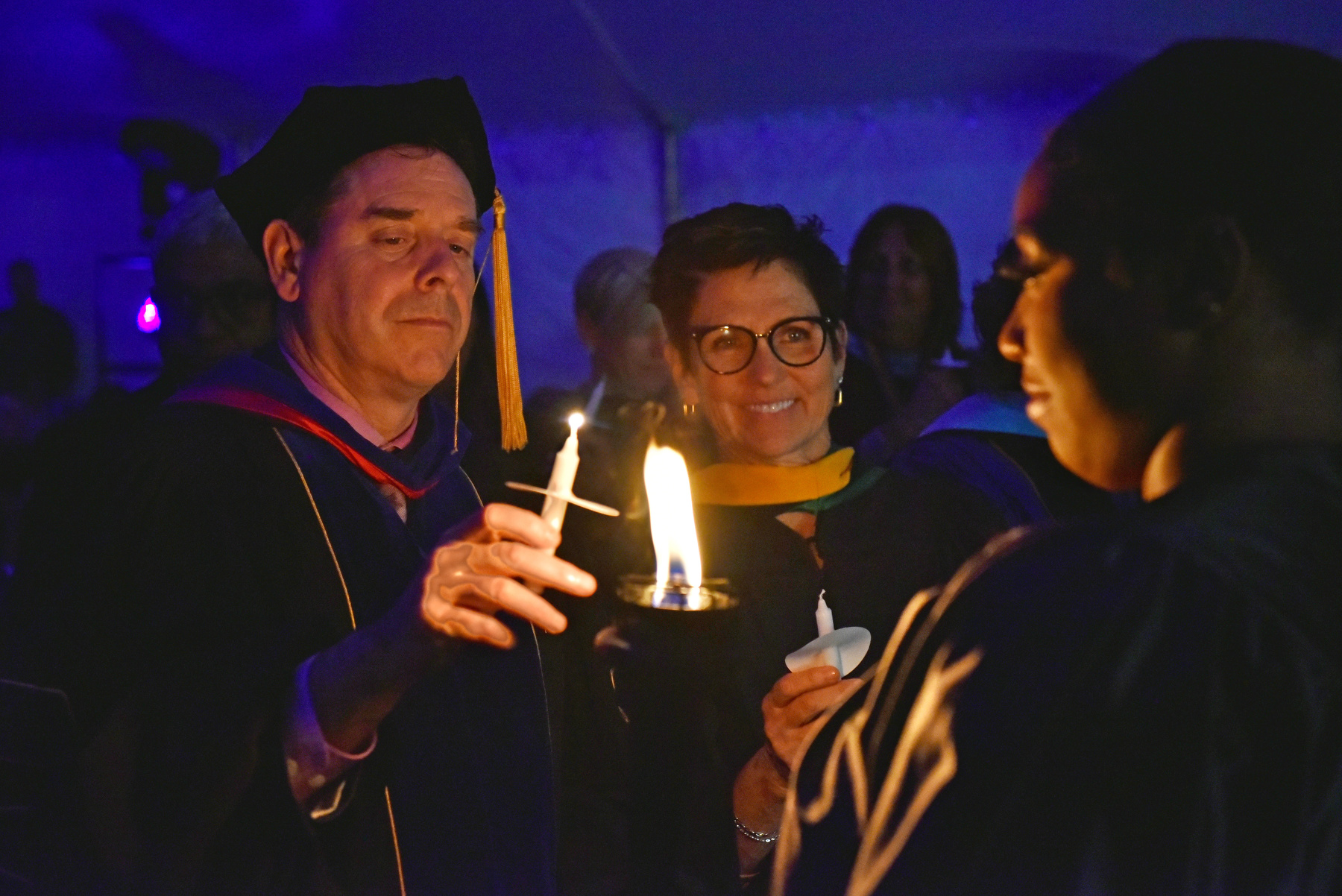 Torchbearer Danielle Boxill '23 lights the candles held by Provost Scott Furlong and Vice President of University Advancement Mary Gibbons Canale '81.