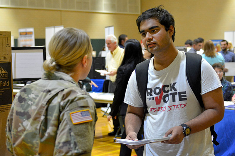 Sophomore software engineering major Shakhar Dasgupta (right) speaks with Sgt. Erica Loucks of the New York Army National Guard during the Office of Career Services' Fall Career Fair Oct. 19 in Marano Campus Center's Swetman Gymnasium. Dozens of organizations recruited and otherwise assisted students who are exploring careers, internships or cooperative education experiences.