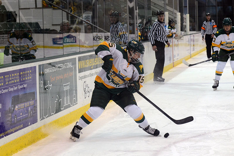 David Ferreira (left-center in white) shoots and scores Oct. 28 in the men's ice hockey team’s season-opening 7-1 victory over Elmira College. The junior forward tallied the goal just short of nine minutes into the final period, extending the Lakers' lead to 6-0. Also scoring was Kenny Neil, who would go on to notch a hat trick with half of Oswego's goals in a 6-3 win at Elmira on Saturday. Alex Botten, Jody Sullivan, Aaron Huffnagle, Matt Galati and Andrew Barton also added their first goals of the season. The team returns to the Marano Campus Center ice at 7 p.m. Saturday in a SUNY Athletic Conference matchup vs. Geneseo.