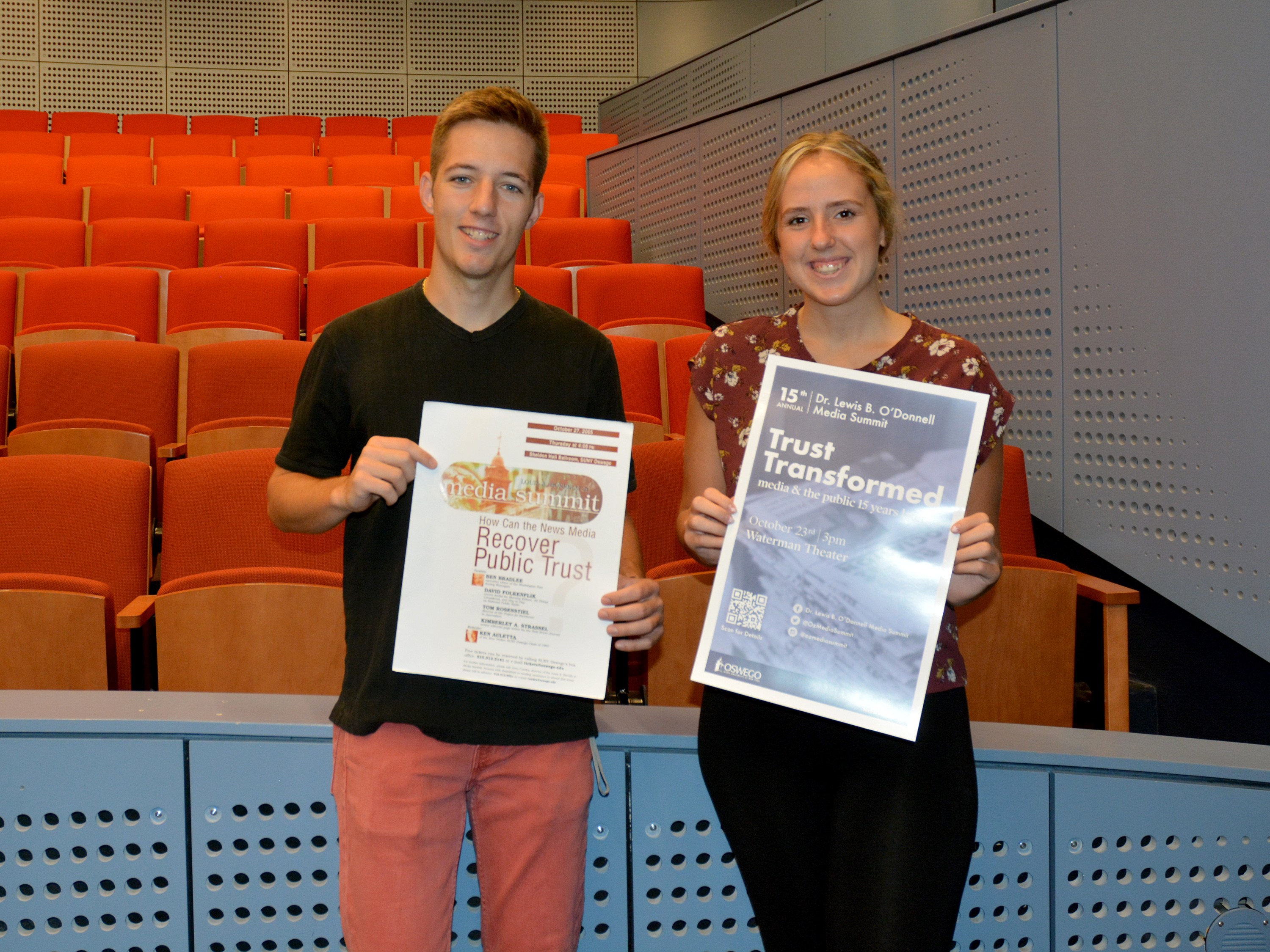 Continuing legacy -- SUNY Oswego’s Lewis B. O’Donnell Media Summit student co-event directors Joshua Holfoth and Victoria Kammer hold posters for the inaugural 2005 edition and this year’s event, "Trust Transformed: Media and the Public, 15 Years Later." An all-star panel at 3 p.m. in Tyler Hall’s Waterman Theatre highlights the day of activities on Wednesday, Oct. 23.