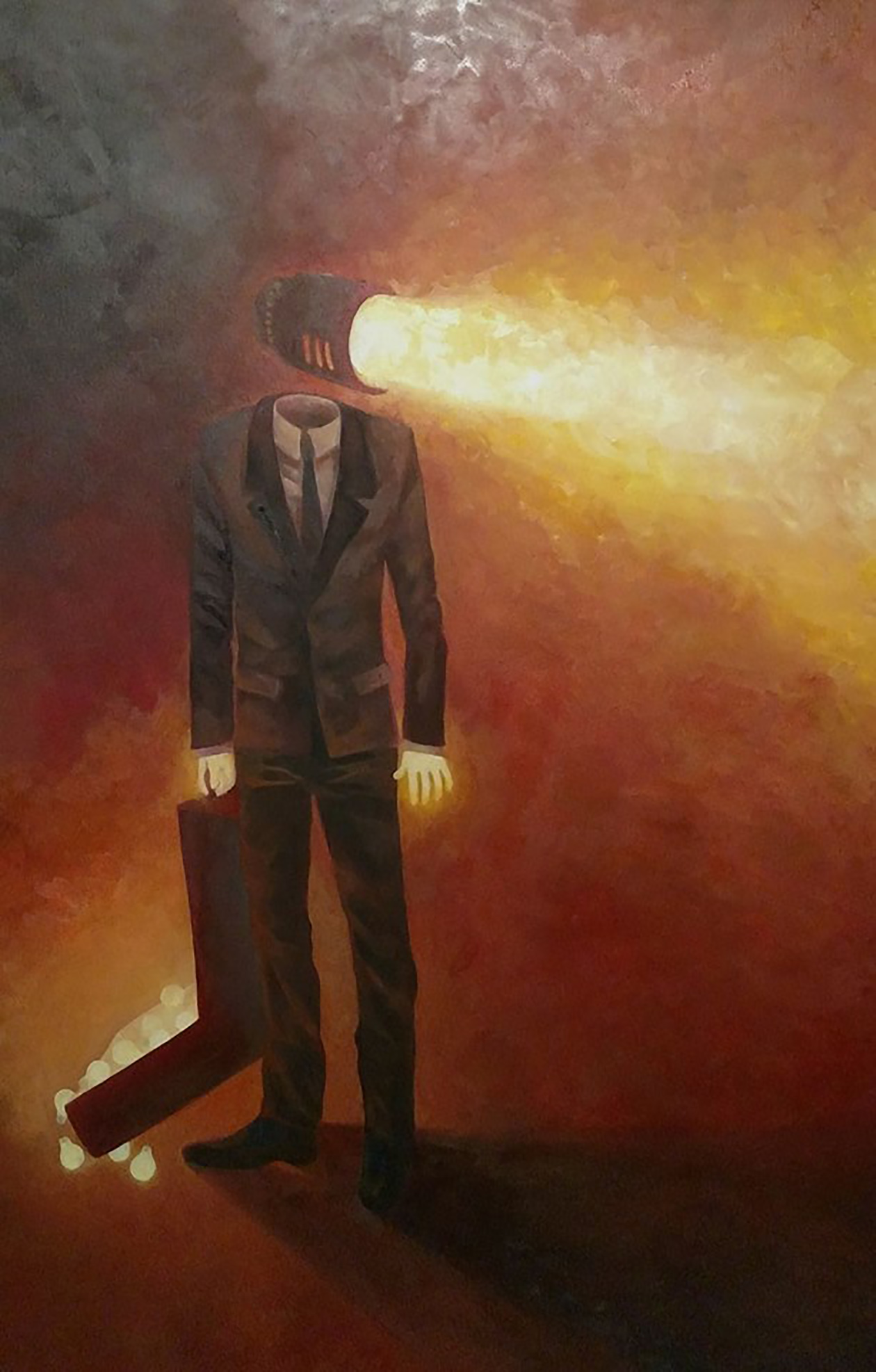 Rebecca Petrie's 2017 piece "Idea Salesman" appears with works of two other area artists in an exhibition titled "Love, Answers and the Otherworldly: Abstractions and Allegories," which runs through Aug. 31 at SUNY Oswego in Syracuse, 2 Clinton Square. The show features mixed media and paintings by Danny Bertrand, Alex Medlin and Petrie. The exhibition is free and open to the public. SUNY Oswego in Syracuse is open 8 a.m. to 4:30 p.m. Mondays through Fridays, though closed July 4. Hours are variable for evenings and weekends; call 315-399-4100 for the times. Contact Amy E. Bartell, coordinator of community art exhibitions, amy.bartell@oswego.edu, for more information.