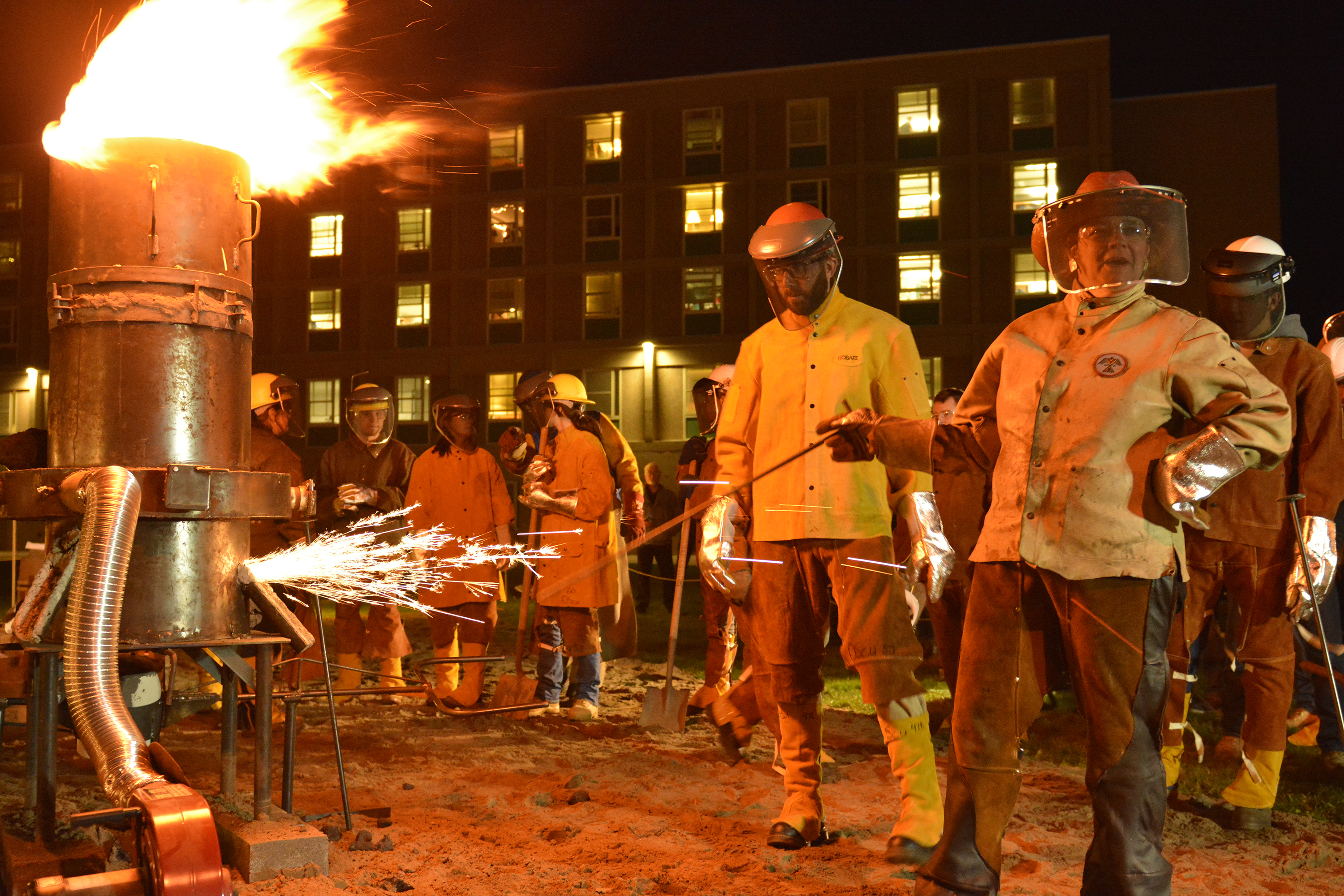 The iron pour, a signature event of students in Benjamin Entner's sculpture classes and the materials classes of technology faculty member Richard Bush, will take place approximately from 2 to 6 p.m. April 13 on the north side of Tyler Hall.