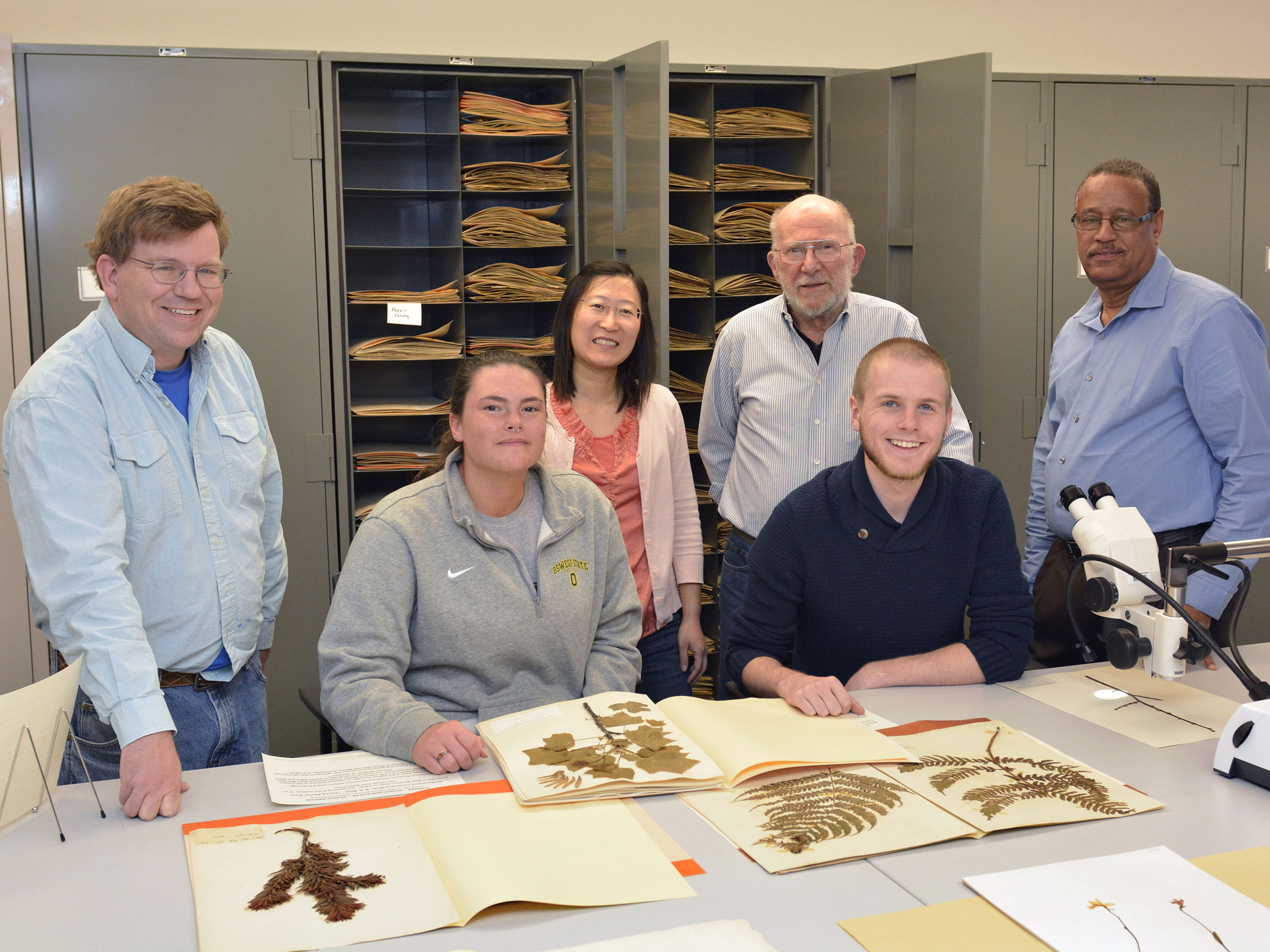 PHOTO CAPTION: Herbarium team -- Among those at a reception in Room 306 of the Shineman Center celebrating the four-year project to restore and index more than 50,000 plant specimens in SUNY Oswego's collection are (standing from left) biological sciences faculty members Eric Hellquist and Jinyan Guo, project leader and professor emeritus Andrew Young and Rice Creek Field Station Director Kamal Mohamed. At the table (from left) are students Sarita Charap and Robert Jarvis, assisting in restoration of damaged specimens.