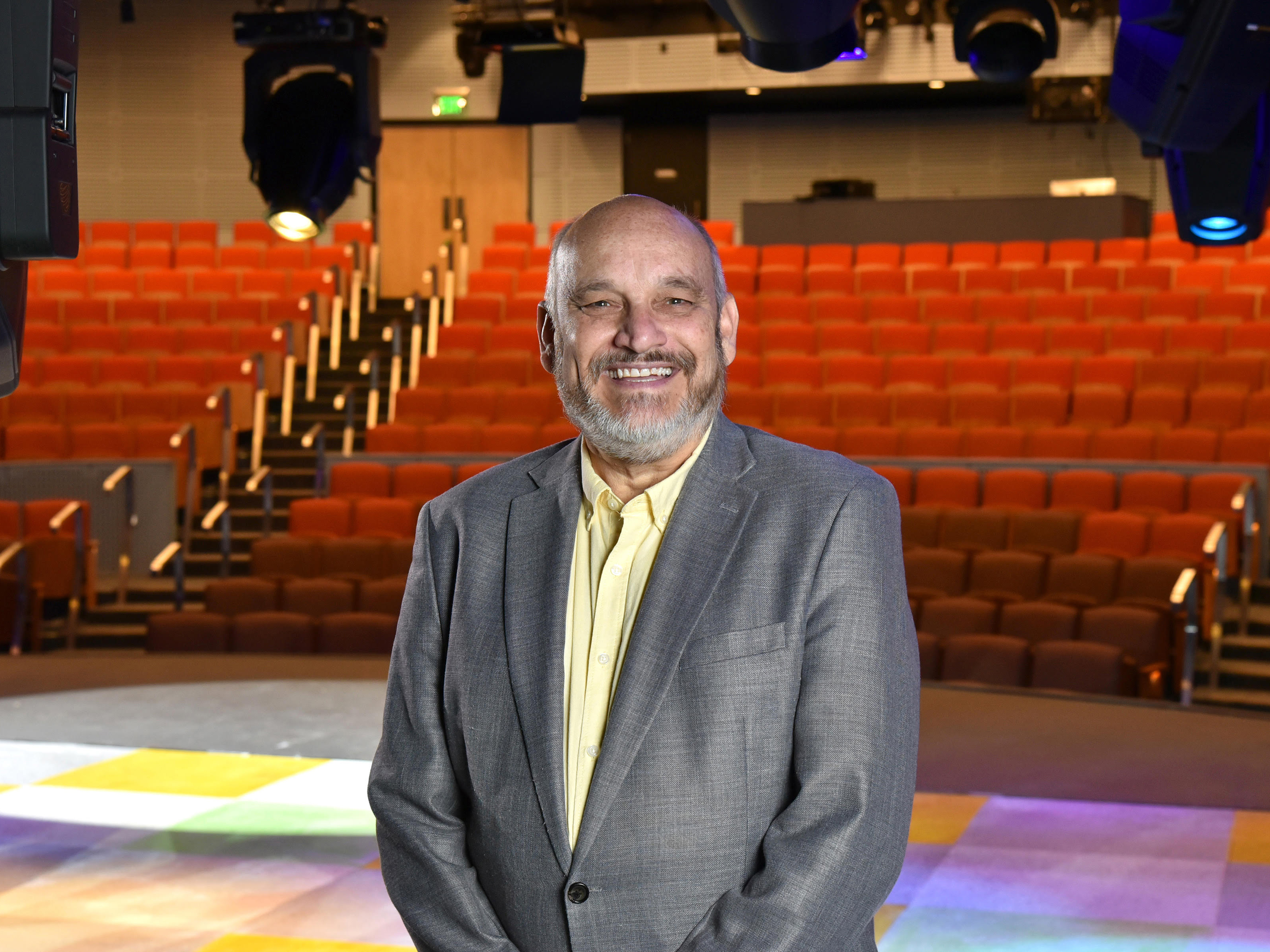 Take a bow -- Brad Korbesmeyer, shown on the stage of Tyler Hall's Waterman Theatre, recently retired from the English and creative writing faculty after nearly three decades of teaching, mentoring and helping build stronger writers.