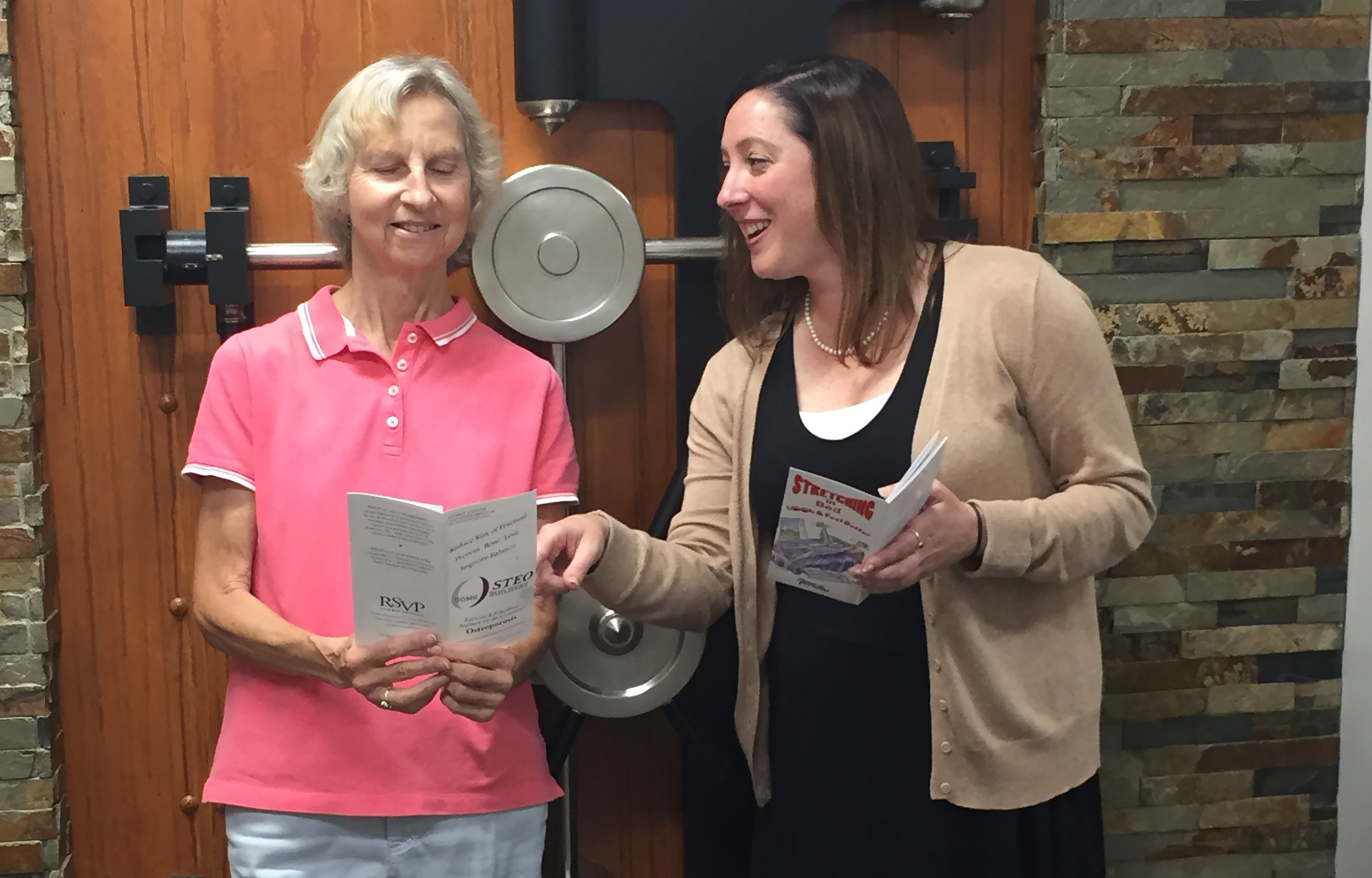 New program -- Meave Gillen (right), director of the Retired and Senior Volunteer Program in Oswego County, speaks with volunteer Linda Hall about a longstanding RSVP initiative, Osteo Bone Builders. Gillen announced that RSVP, the county and Pathfinder Bank will launch a new program to provide crucial financial information to seniors, starting with an Aug. 8 workshop in Room 118 of Rich Hall.