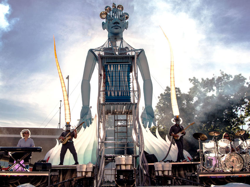 Squonk’s music incorporates the swoops and eddies of air with electronic bagpipes and a vertical accordion that is Lady Pneumatica’s lungs, played like a piano while it rises and falls with her breath. Playing with visual puns, air activates costumes. Squonkers inflate like blowfish and musically activate headtubes with wild guitar and bass riffs.