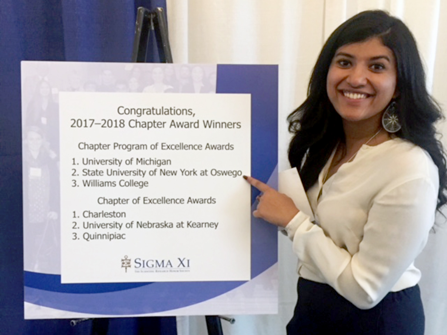 In addition, the SUNY Oswego chapter earned a Sigma Xi Chapter Program of Excellence Award for the "Sigma Xi Student Award at the Quest Symposium” program.