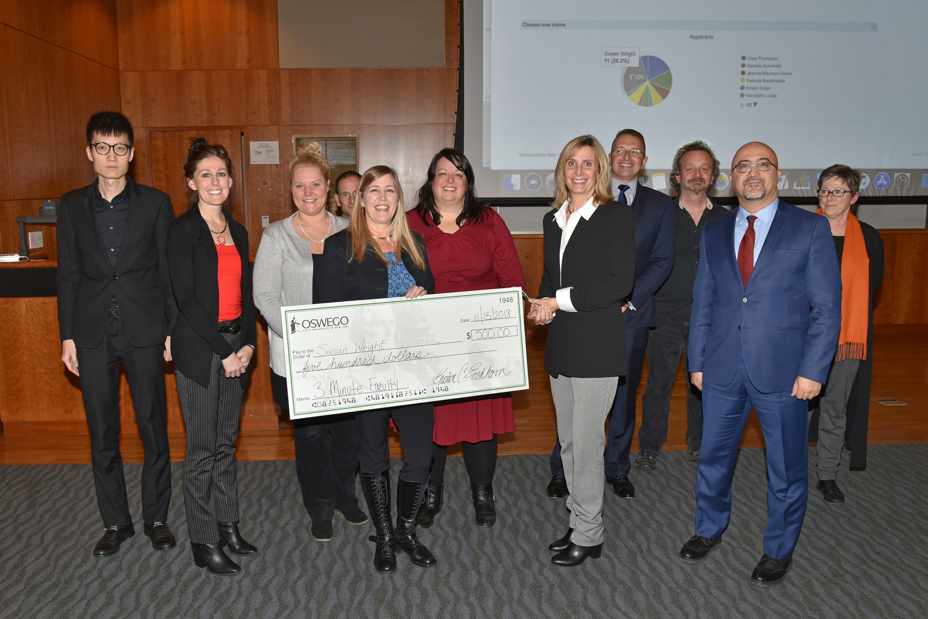 'Lightning talks' -- A dozen participants in the SUNY Oswego Division of Graduate Studies' first 3-Minute Faculty competition in research presentations included winner Susan Wright (holding check) and (from left) Yi Liu of accounting, finance and law; Kristin Sotak of management and marketing; Jessica Maureen Harris of health promotion and wellness; Steven Abraham (partially hidden) of management and marketing; Michele Thornton of management and marketing; Marybeth Longo of communication studies; Stathis Kefallonitis of management and marketing; Damian Schofield of human-computer interaction; operations management instructor Yavuz Keceli, the seventh of the School of Business competitors; and Cara Thompson of art.