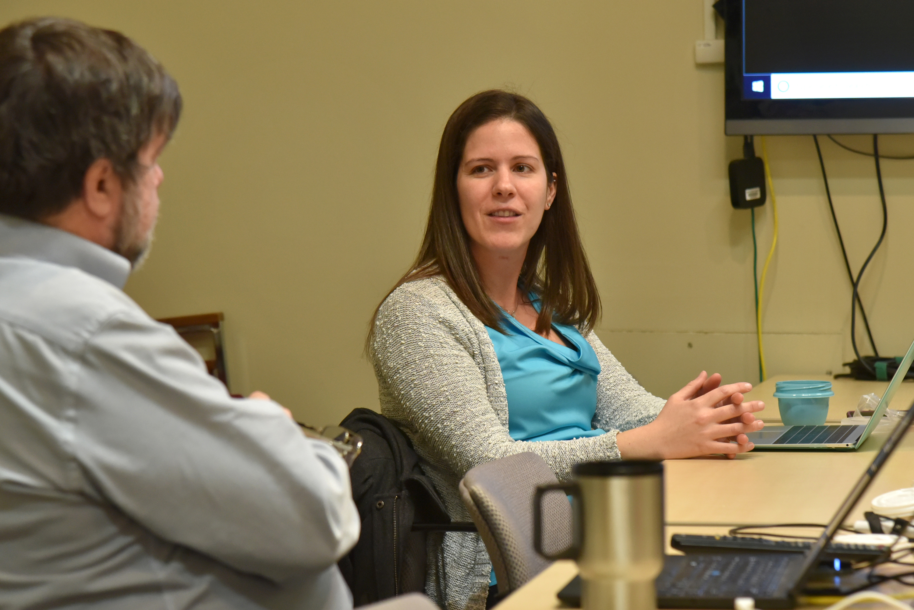 Teaching fellows Elizabeth Dunne Schmitt of economics, Eric Hellquist of biological sciences and Elizabeth Keida of the School of Education's health promotion and wellness program attended a recent training follow-up discussion in CELT's office in Penfield Library. Other fellows -- including Mamta Saxena of human development, Mark Springston of technology and Michael Quirk of intercollegiate athletics -- attended remotely via Zoom video conferencing. Kane, an economics professor, coordinated the session.