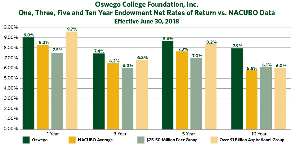 SUNY Oswego’s returns during 2018 were 9 percent, nearly a full percentage point higher than the national average of 8.2 percent. The short-term endowment investment results allow spending rates to be maintained at 5 percent and still cover the current 2 to 2.5 percent inflation rates.