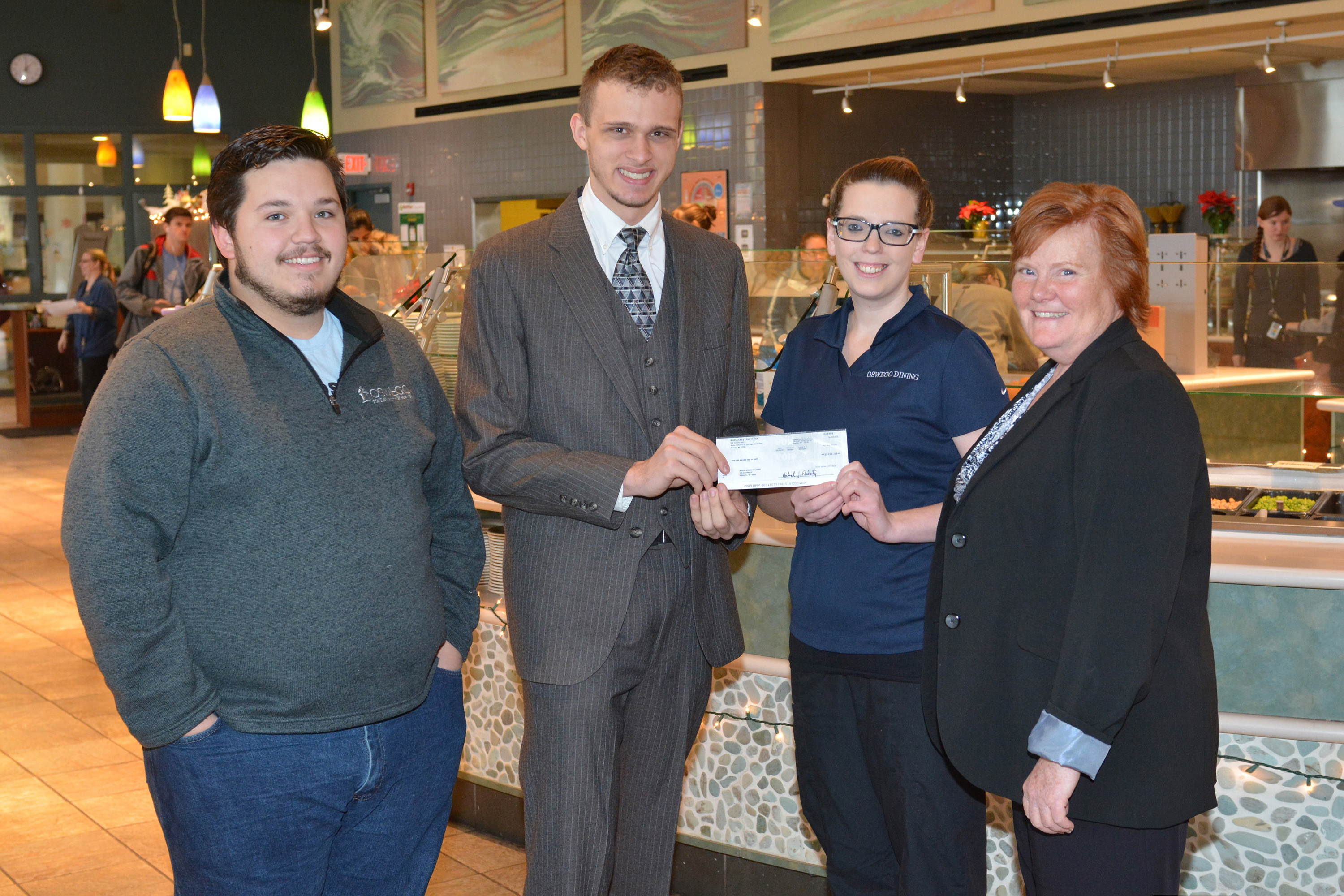 Generous effort -- More than 1,250 SUNY Oswego students participated in the fall semester's Miss-A-Meal fundraiser, netting $4,159 for United for Puerto Rico, a fundraising collaborative to provide relief to the Hurricane Maria-damaged island. From left are junior political science major Dalton Bisson, president of the Student Association; sophomore broadcasting and mass communication major Connor Douglass, Miss-A-Meal chair and a second-year Student Association senator-at-large; Loni Clemons, a cashier at Lakeside Dining Hall; and Ruth Stevens, director of resident dining for Auxiliary Services. Since at least the early 1960s, Oswego students have carried the tradition forward, skipping a meal each semester and donating what they would have spent to one or more charitable organizations.