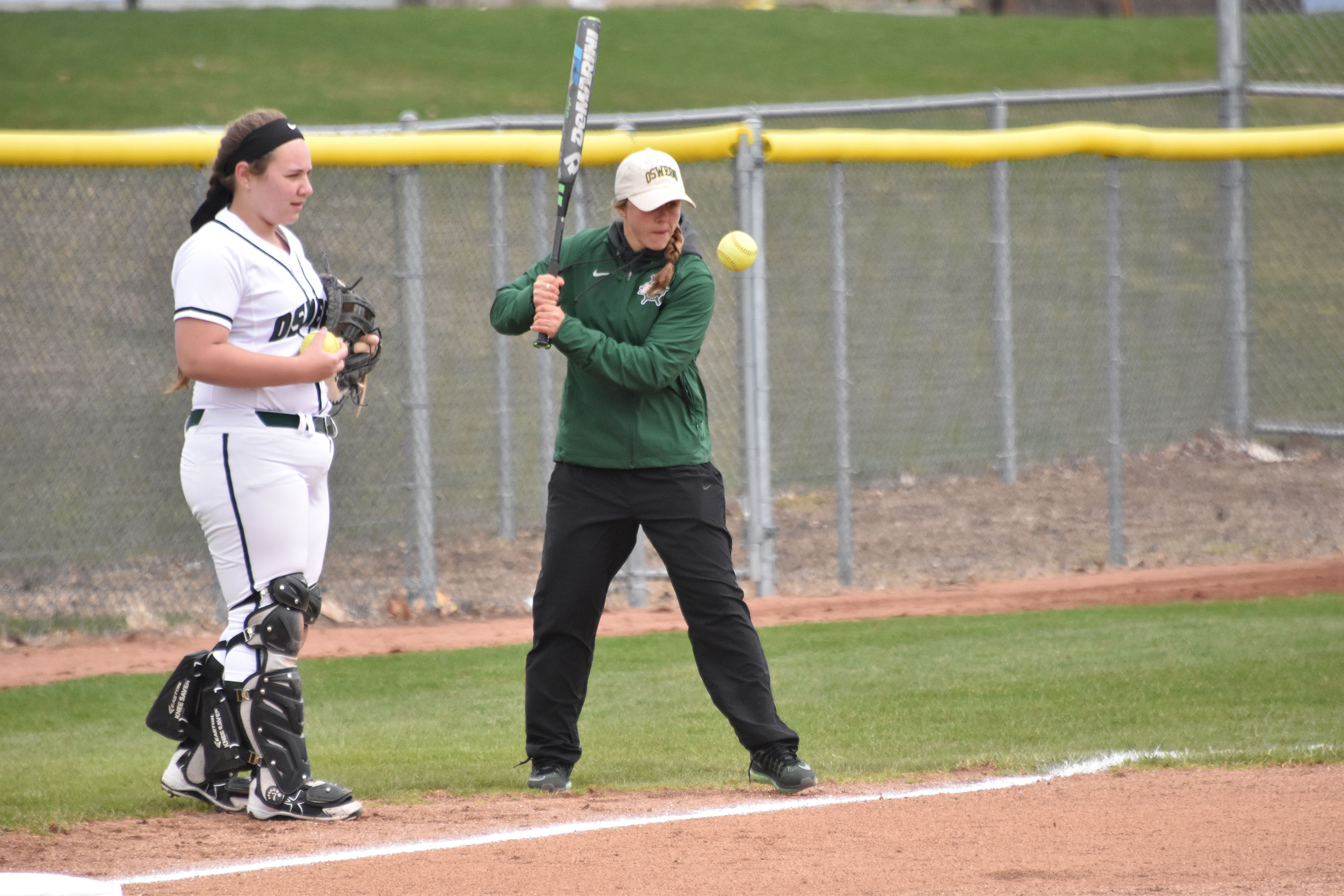 Professional certification -- SUNY Oswego graduate student Morgan Nandin (right), assistant coach of the Lakers softball team, works with freshman catcher Jenna Gotte prior to a recent doubleheader with Fredonia. Nandin expressed delight that she can now earn professional teacher certification in physical education or health education as she completes a master's degree in education.