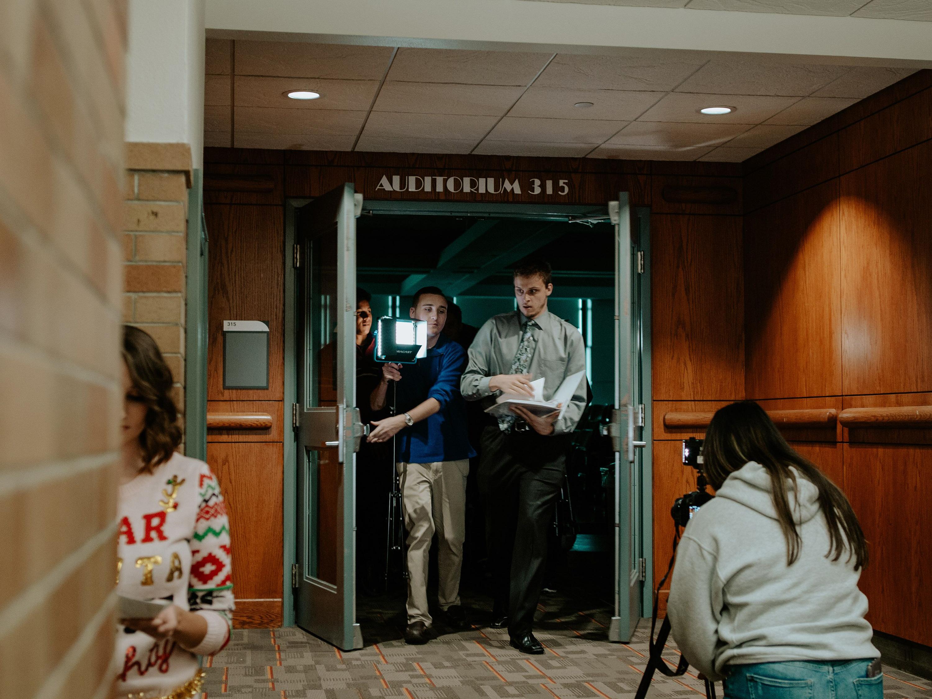 Award-winning production -- “The SUNY Oswego Holiday Television Special,” written, produced by and starring around 50 students, was one of three student projects to win national Broadcast Education Association awards. “Matt and Carl in the Morning” on student-run radio station WNYO and James Kattato’s “Salar Faryar Profile” won awards as well. (Photo by Megan Briggs)
