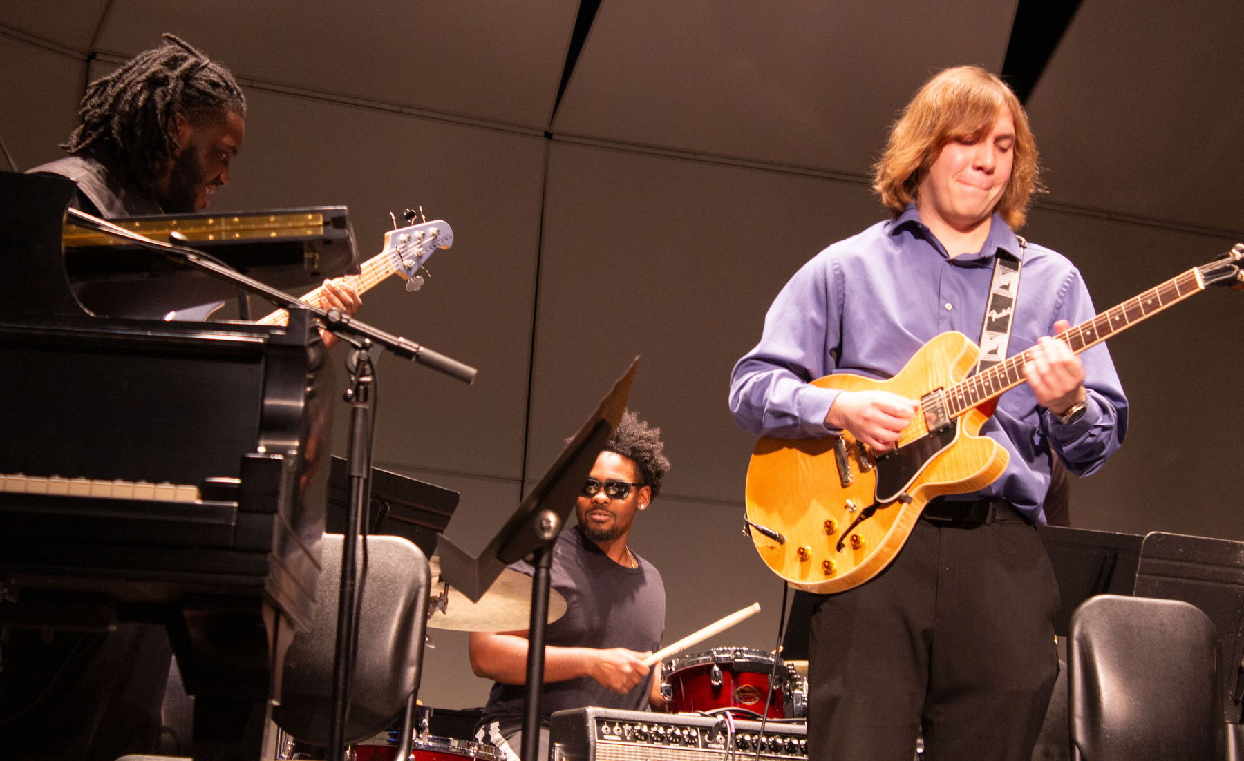 An original composition featuring student musicians during the Music Department's Collage Concert included Timothy Altbacker, vocals and rhythm guitar; Brandon Schmitt, lead guitar (left); Elijah Gebera, bass (right); Cameron Polidore, drums (center); and Angelo Antonelli, synth. (Photo by Graceann Cleator)