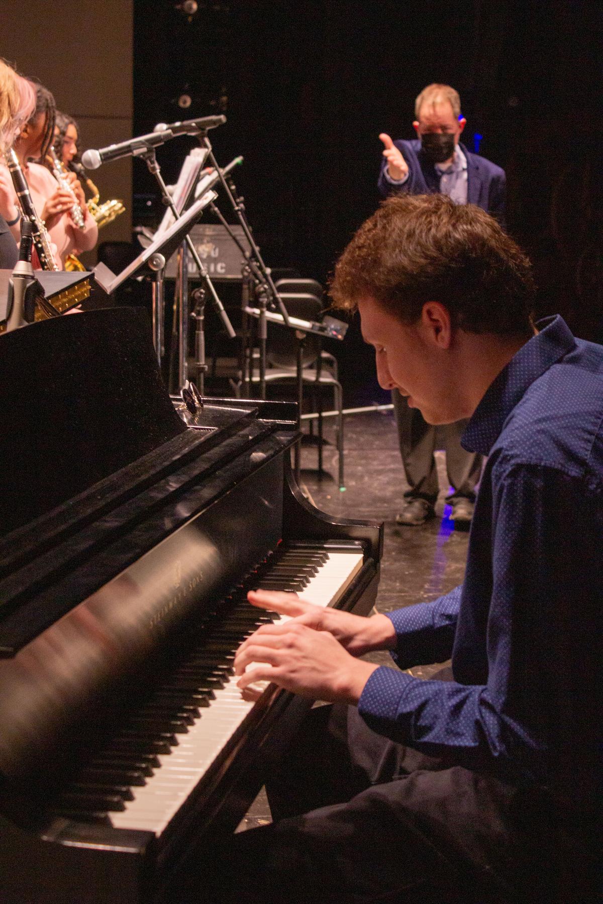Student Angelo Antonelli plays piano along with the Oswego State Latin Jazz Ensemble directed by Eric Schmitz during the Music Department’s Collage Concert. (Photo by Graceann Cleator)