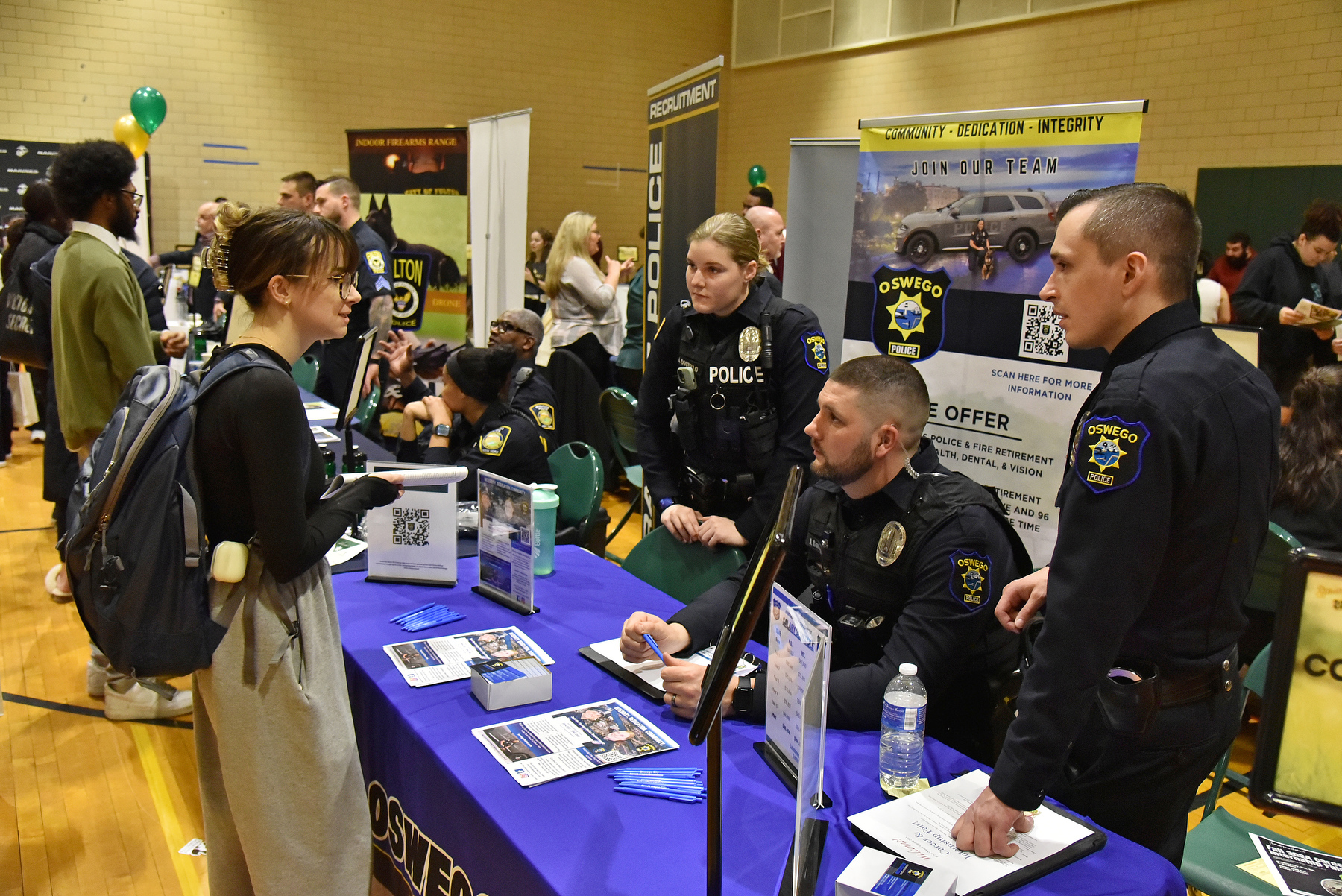 Oswego students networked with over 100 employers and professionals at the Spring 2024 Career and Internship Fair. The event hosted by Career Services was held March 6 in the Swetman Gym in Marano Campus Center. Pictured, senior criminal justice major Emma Monaghan talks with Officers from the Oswego Police Department.
