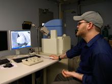 Brett St. Pierre, a geology major, used a scanning electron microscope to examine clay from Martha's Vineyard and classify the fossilized plant material he finds. This work is following in the footsteps of Dr. Bruce Tiffney and his discovery of an unknown fossilized plant from the same area during the 1970s. Brett hopes that with the technological advancements and new information gained since then, the work may lead to the classification of the oldest known flowering plant.